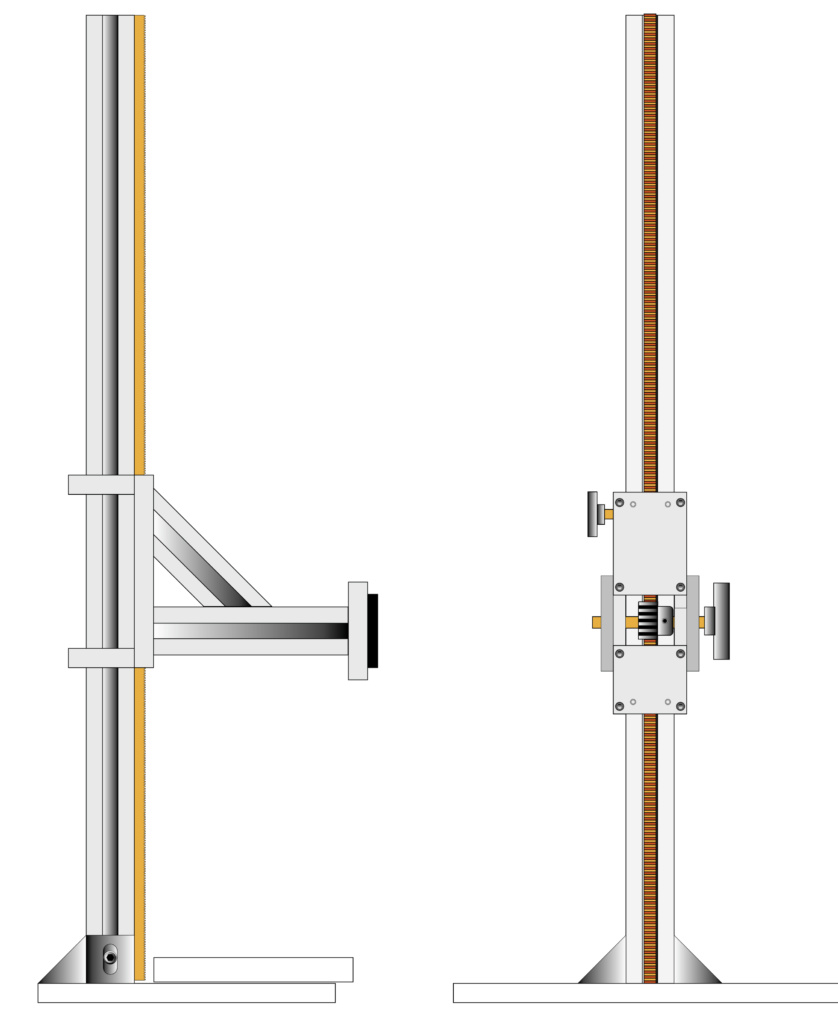 Here are my Illustrator sketches of the camera stand as I conceived it. The vertical post and the horizontal arm are both aluminum extrusions from 80/20, the company that has revolutionized extruded aluminum beams and connectors for makers.
