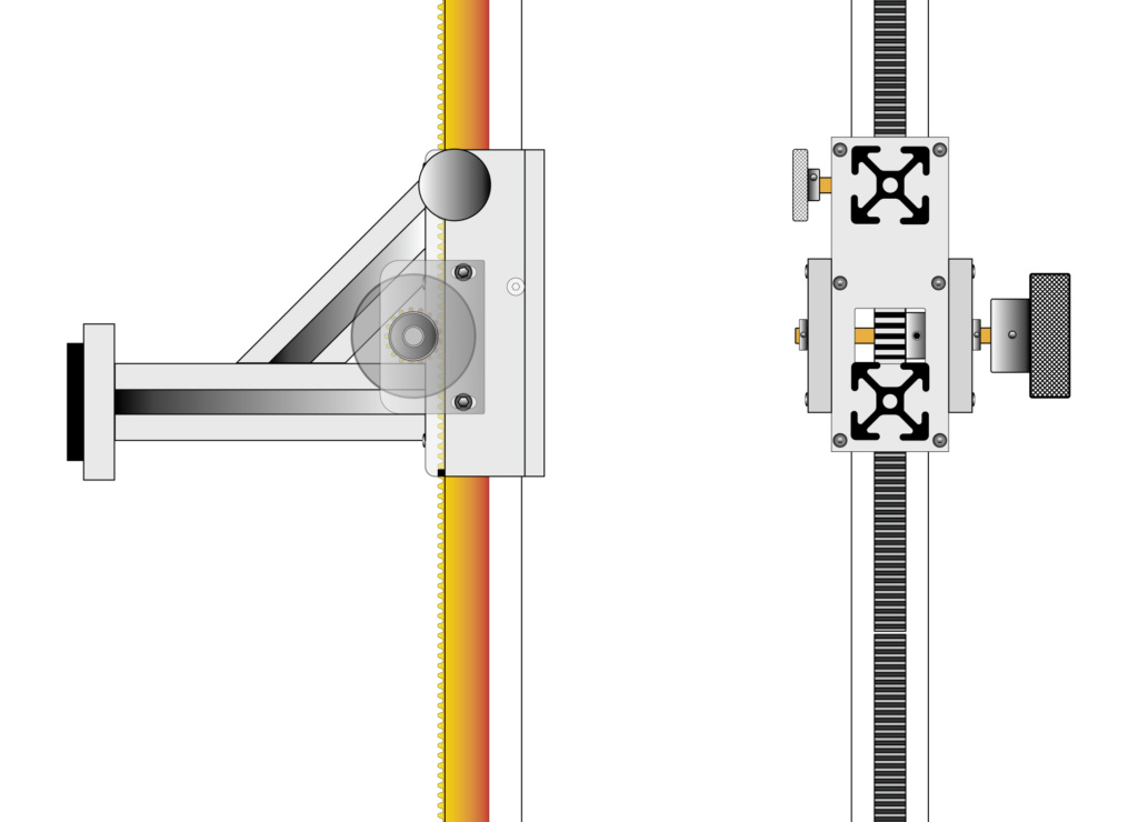These drawings describe the detailed workings of the moving camera bracket as I intended to make it. On the right I put an accurate silhouette of the 80/20 aluminum bars where they would connect to the moving bracket. The gear rack runs vertically in the post, which I had to machine to fit the rack, which is made of steel.