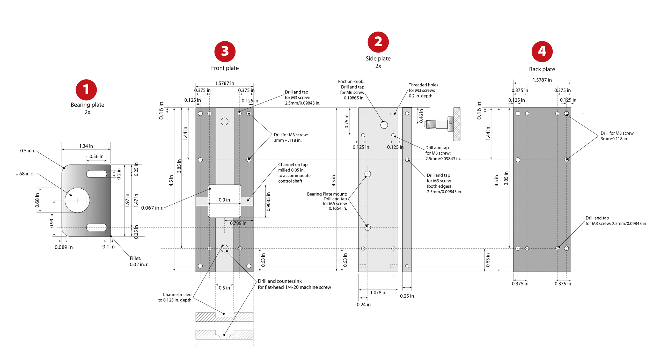 All of my holes are drilled to metric sizes, and all of my tapped holes were made with metric taps. I added 6mm bearings and collars to the control knob shaft, and I added 6mm threads to the friction knob.