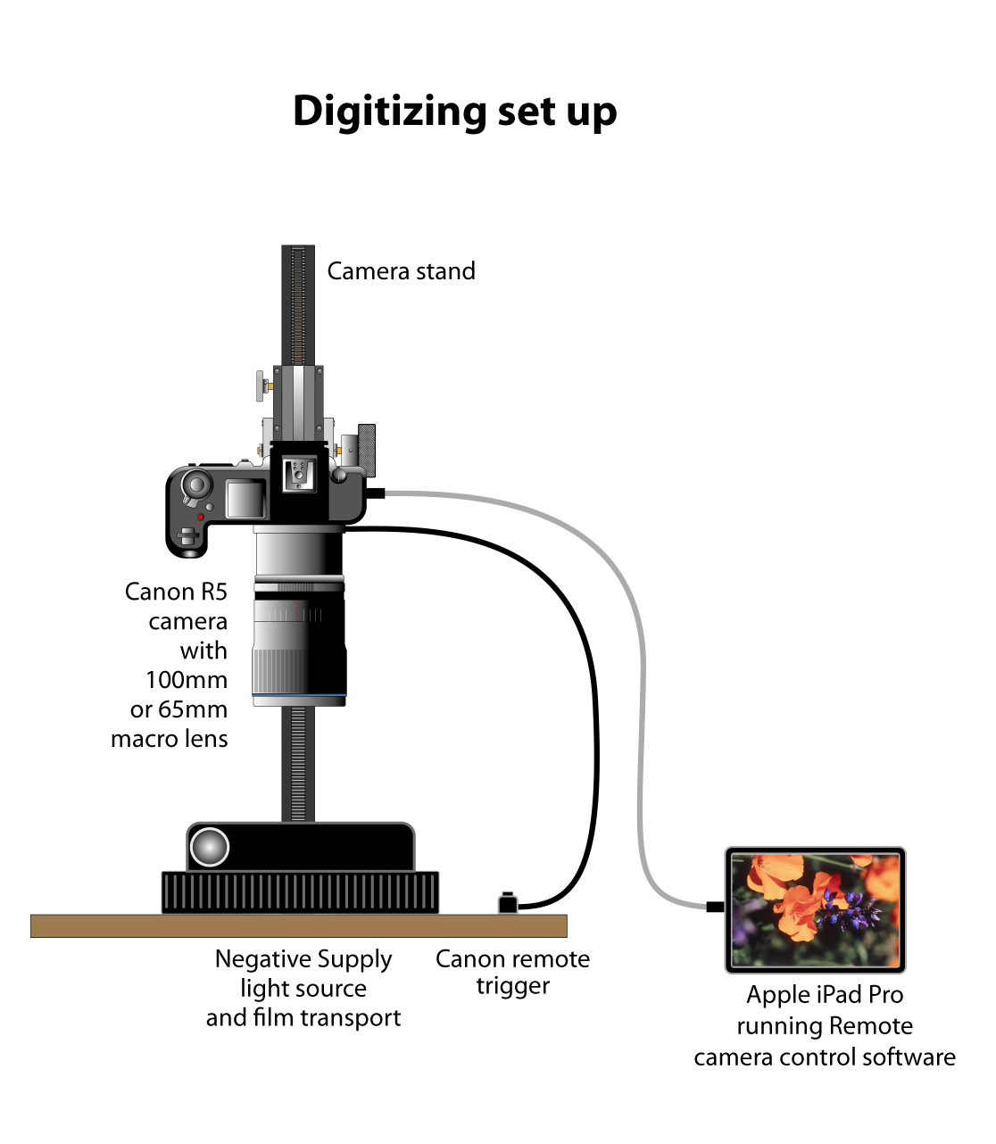 This is my complete digitizing set-up: stand, camera, lens, light source, film transport, iPad for previewing, and the associated software – NegativeLab Pro for converting negatives into positives, and an app on my iPad that allows me to see a live view on that device.
