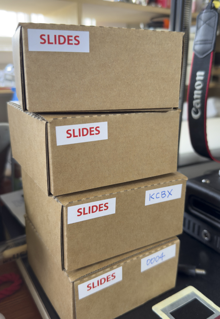 I bought a pack of small stickers on which I printed “SLIDES” to put on the face of envelopes whose contents are in the storage cartons.