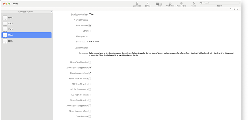 So, the system is in place. I have the process working, and I am now entering information on Envelope 0004. I have scanned 35mm color negative film, color transparencies and mounted color transparencies (slides). I have entered information into the database and tested it for searching. It seems to work perfectly well. Long-term use will tell, of course.