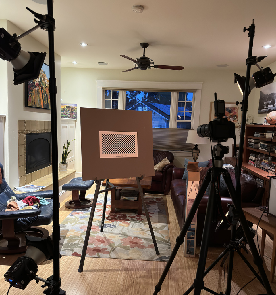 The process of making a lens profile is to print-out one or more checkerboard patterns to paper, then mount those to foam core board and photograph them under proper lighting. The manual explains that I should take a minimum of 9 photos of each pattern. You start in the middle, with the target dead-center in about the middle of a frame, then you turn the camera about 30 degrees left and take a photo, then turn the camera 30 degrees to the right, and repeat the shot. Then, I am instructed to tilt the camera up about 30 degrees and repeat that process, then tilt it down 30 degrees and take a final three images.